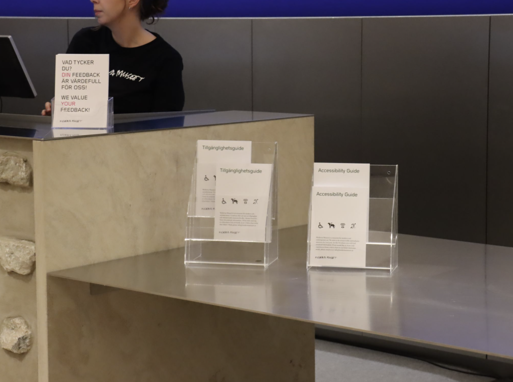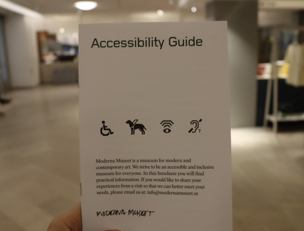 물론 환대는 사람의 태도만으로는 완성되지 않는다. 스웨덴의 모데르나 뮤젯Moderna Museet에서는 접근성 안내 책자가 안내 데스크 바로 옆에 놓여 있었다. 뮤지엄이 접근성을 어떻게 생각하고 있고, 어떤 장치들이 마련되어 있는지를 설명하는 책자다. 이것은 선언적 의미가 있다. 접근성을 고려하는 것이 뮤지엄 내에 얼마나 비중을 차지하는지 선언하는 것이다. 이 선언이 관람객이 자연스럽게 마주치게 되는 가까운 위치에 있을 때, 그것이 전달하는 메시지는 분명해진다.