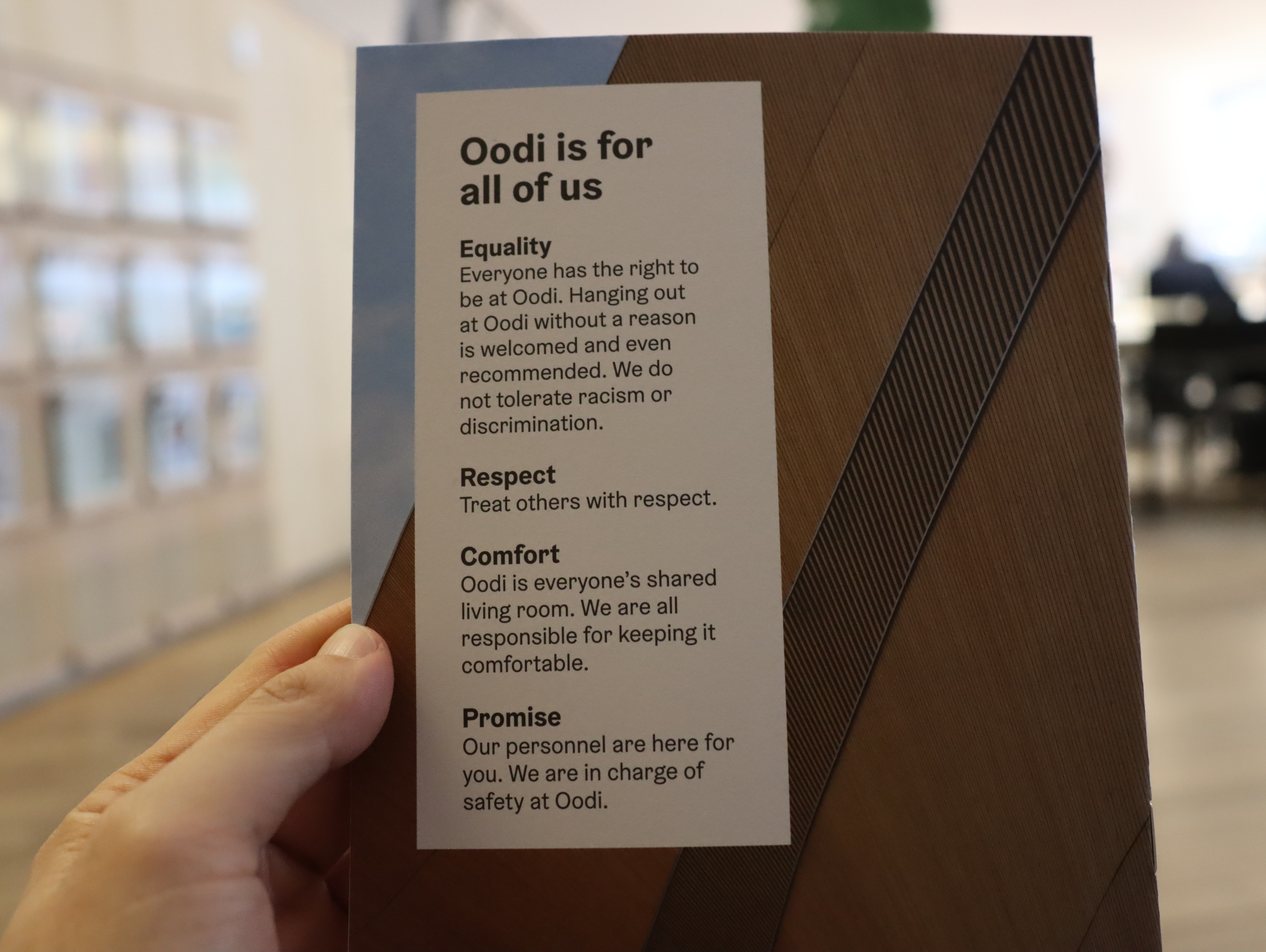 헬싱키 오디 도서관에 방문했을 때도 비슷한 인상을 받았다. 차별하지 않는다는 문구와 모두를 존중한다는 선언이 입구 근처 인포데스크 측면의 벽에 크게 보였다. 또 리플렛의 뒷면에도 이런 내용이 상세히 적혀있다. 사람의 말이나 행동이 없어도, 이 공간이 어떤 태도로 사람을 맞이하는지 전달한다.
